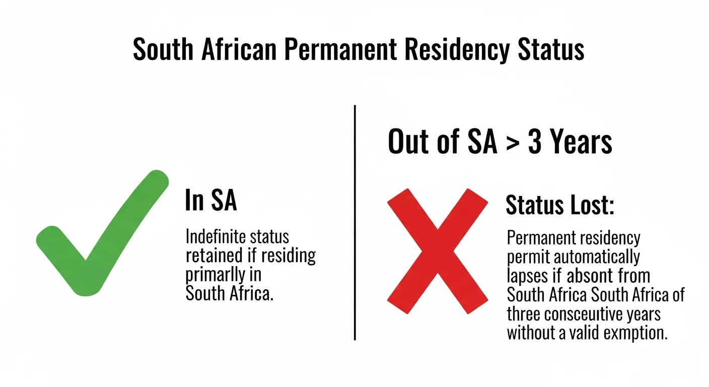Unfortunately, while your permit may not expire, your PR status can. Under South Africa’s Immigration Act, you will lose your PR status if you are absent from South Africa for three consecutive years or more. This rule is often referred to as the 3-year rule.